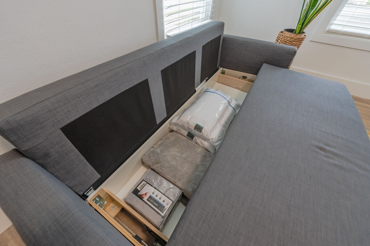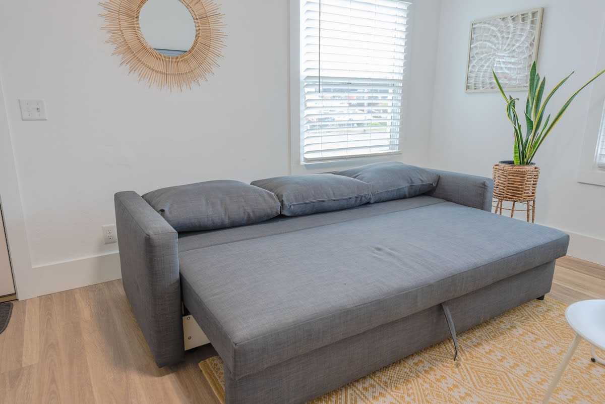 🛏 Living Room: Full-size pull-out 4" foam mattress sofa bed (sleeps 2)