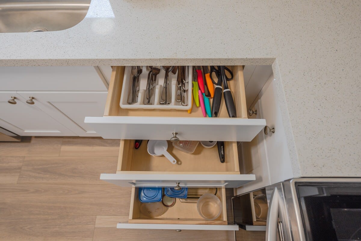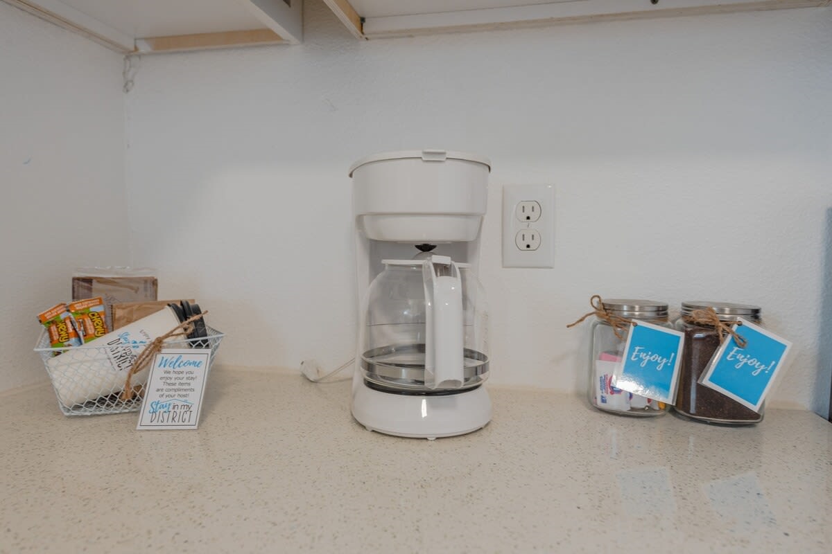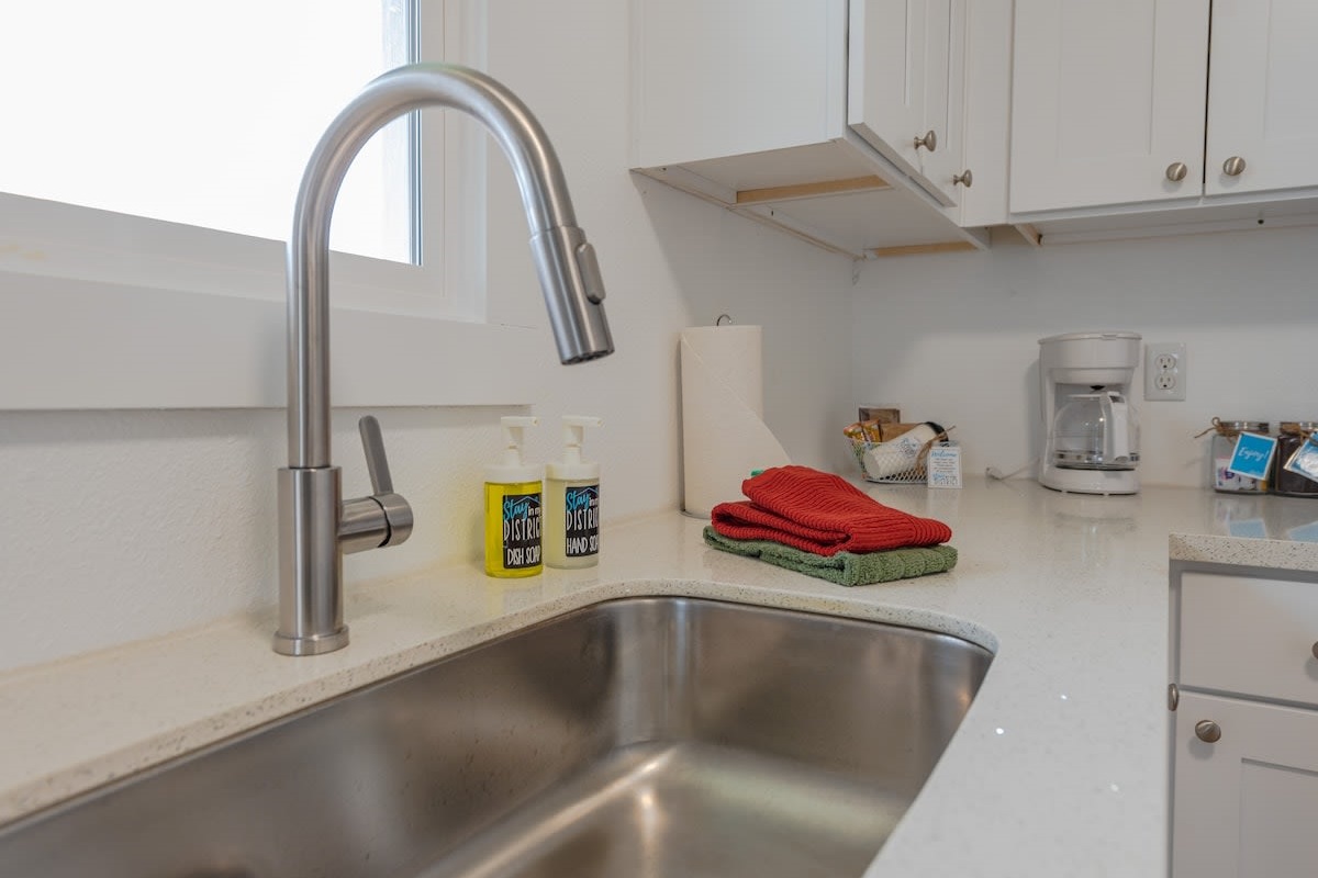 Thoughtfully designed for both relaxation and convenience. The fully equipped kitchen features sleek stainless-steel appliances—including a full-size refrigerator, stove, microwave, coffee maker, and toaster—paired with dishes, utensils, and cookware so you can prepare meals with ease.