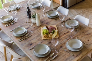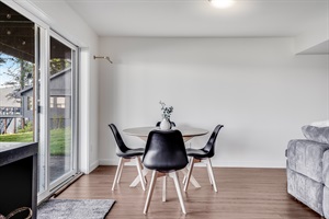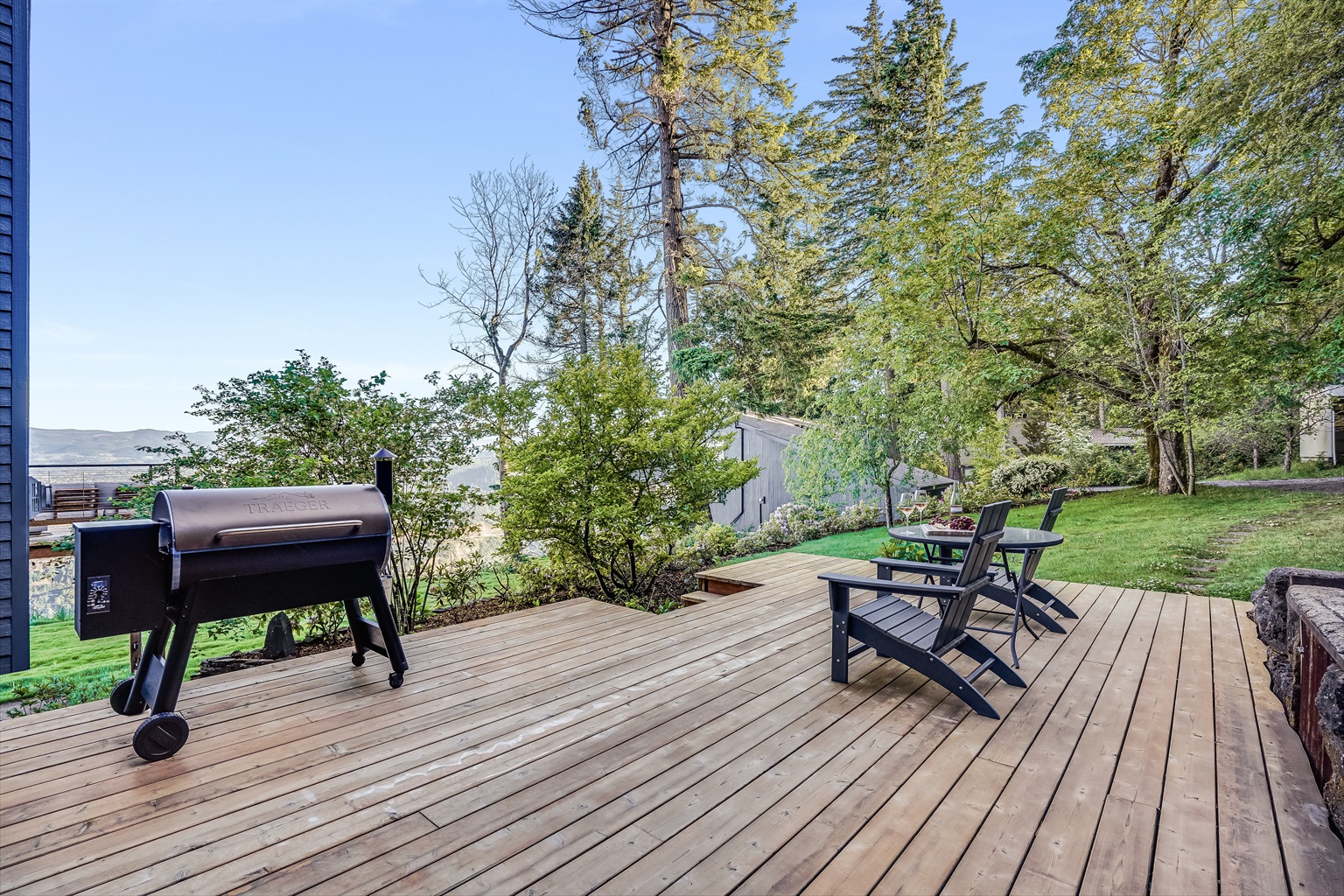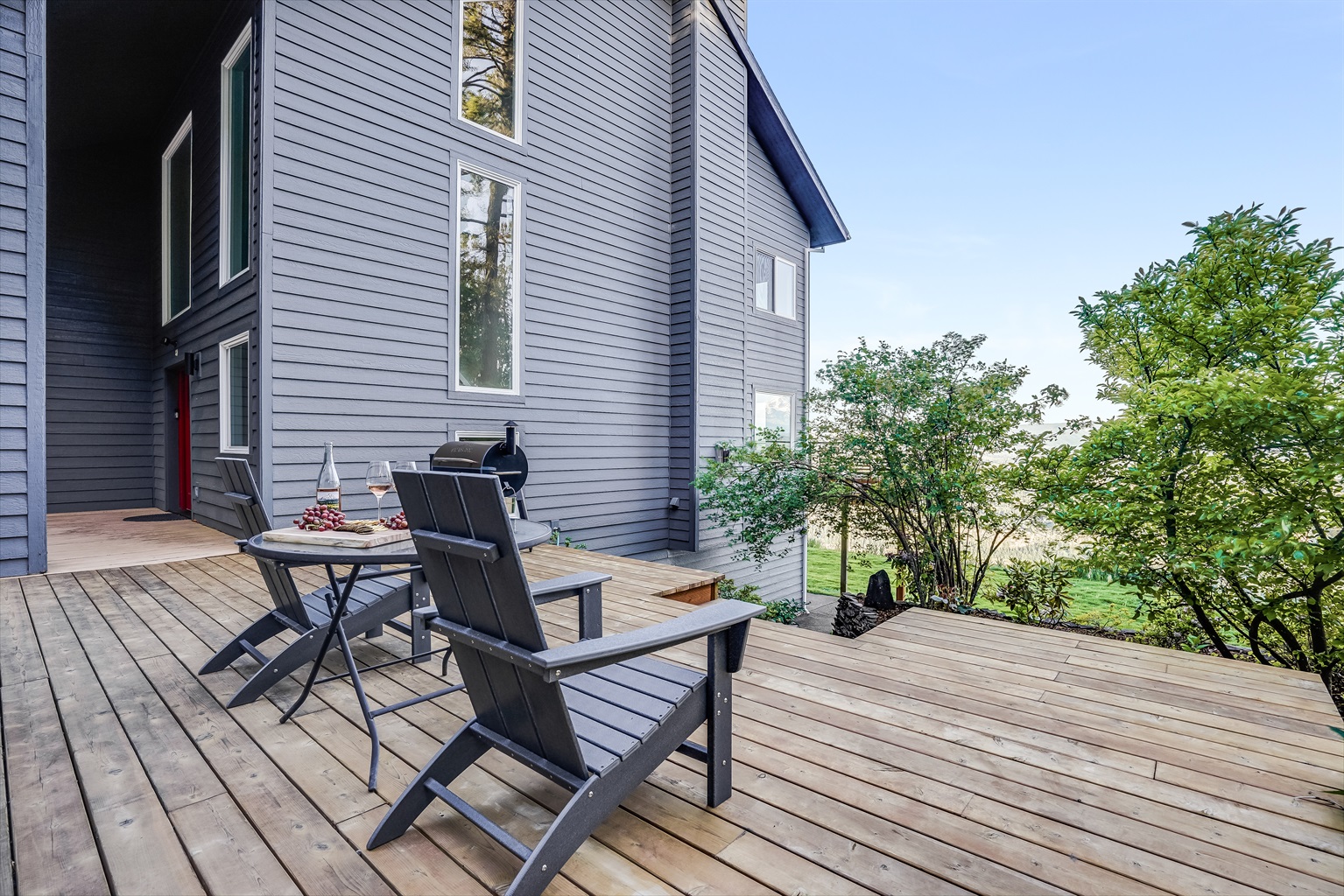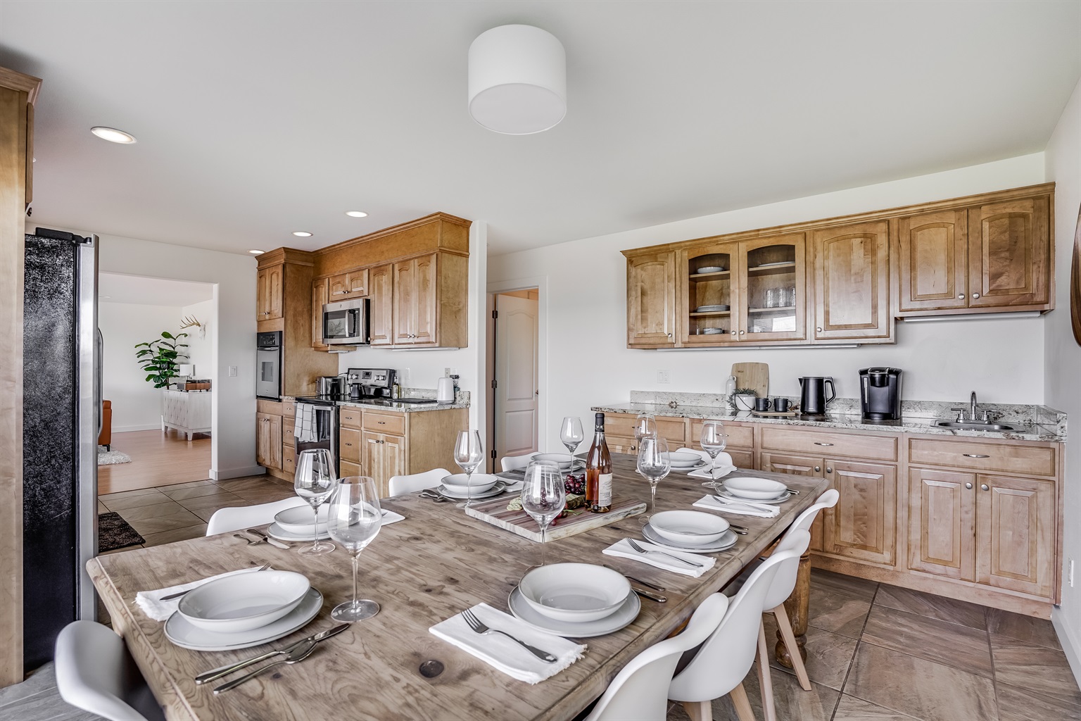 ▪️ Spacious dining table seats 8 comfortably on the upper level with an additional outdoor dining set up on the upper deck overlooking the Columbia River and Mt. Hood