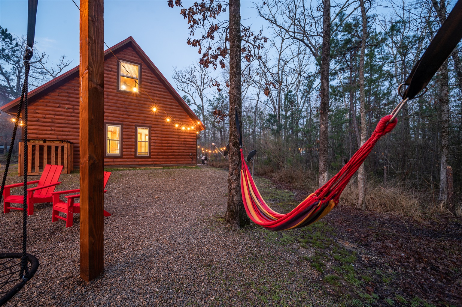 Relax and unwind in our cozy hammock by the fire pit - where every sway brings serenity and every flame adds warmth to your retreat