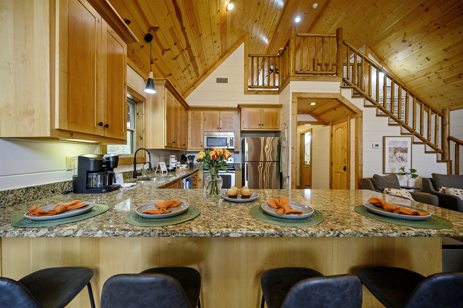 Our cabin's spacious dining area seamlessly blends into the modern kitchen and cozy living room, creating the perfect ambiance for dining, cooking, and unwinding.